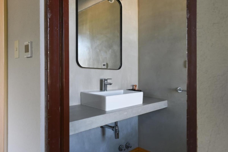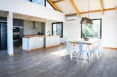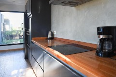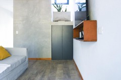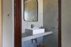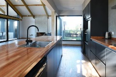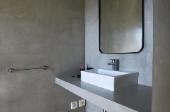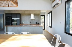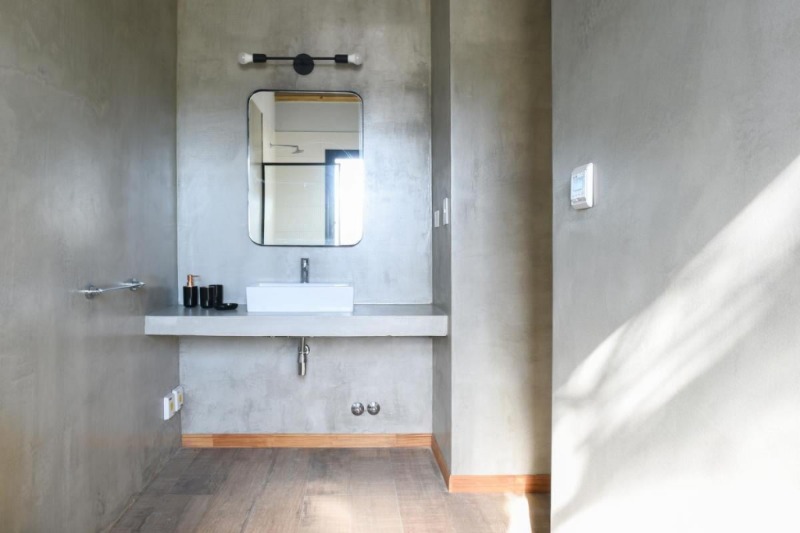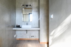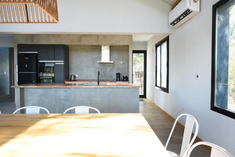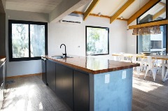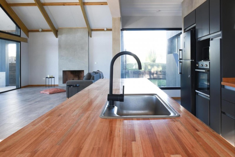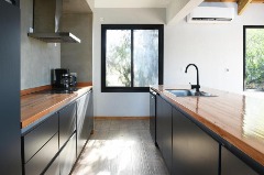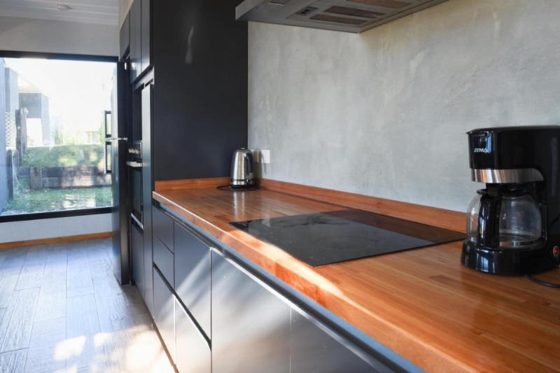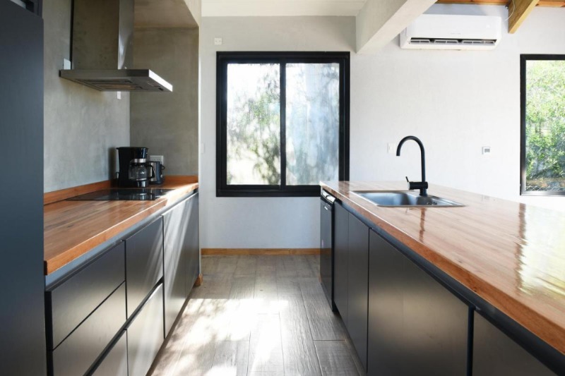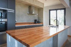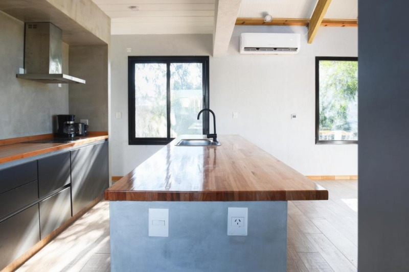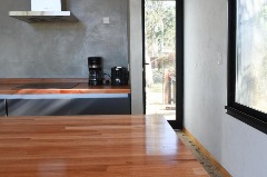 • Mesadas de madera de Euca laqueada transparente en cocina y lavadero. Mesadas microcemento en baños, mesada y banco galería.